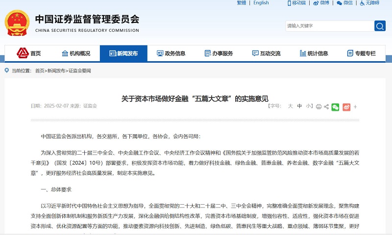 2月7日,证监会发布《关于资本市场做好金融“五篇大文章”的实施意见》。